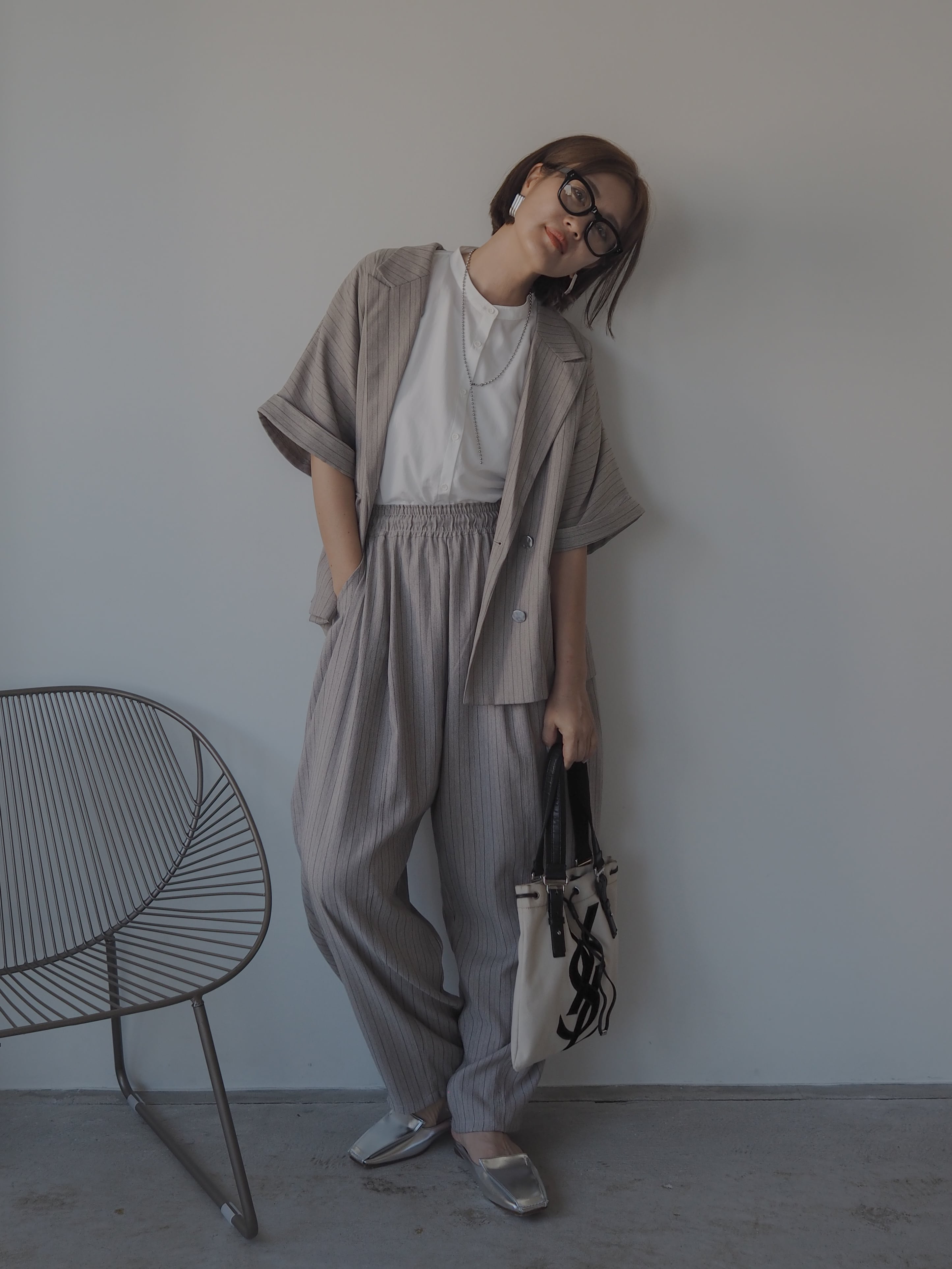メンズライクなピンストライプに、チュールの軽さをプラスして、360度抜け感ある着こなしに。