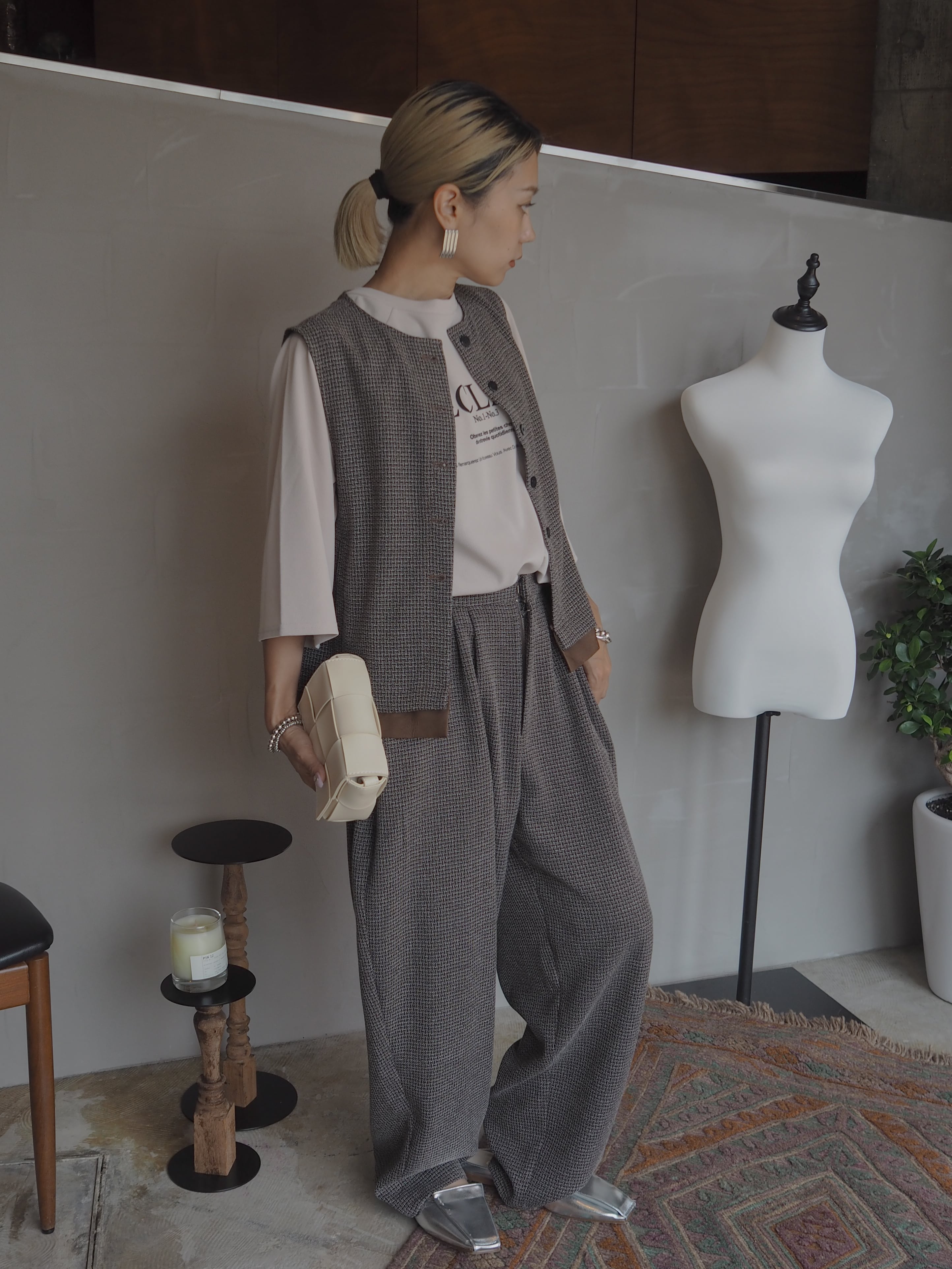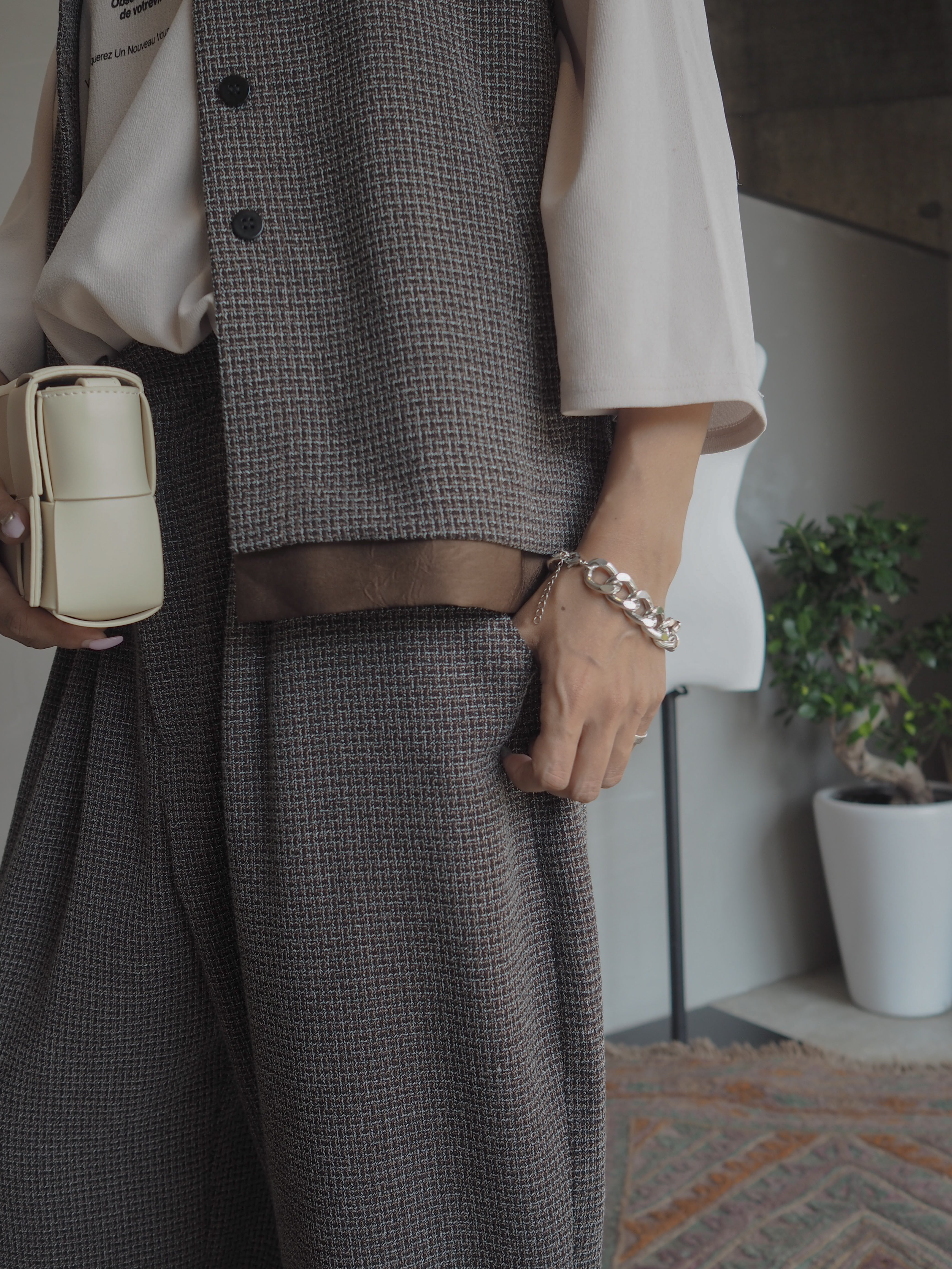 上品な細かいツイード織りに、裾の異素材切り替えでモダンなアクセントを加えたベスト。