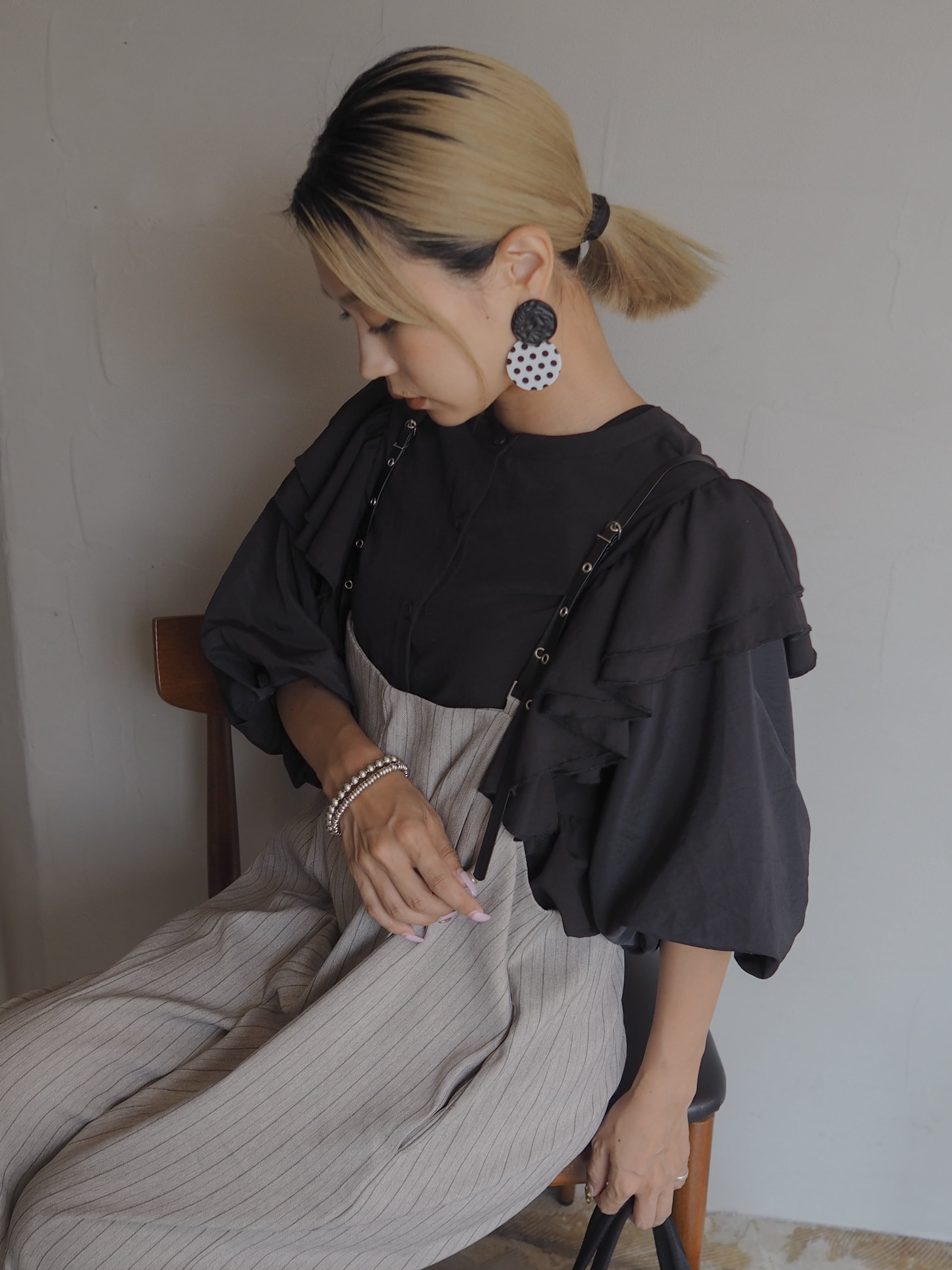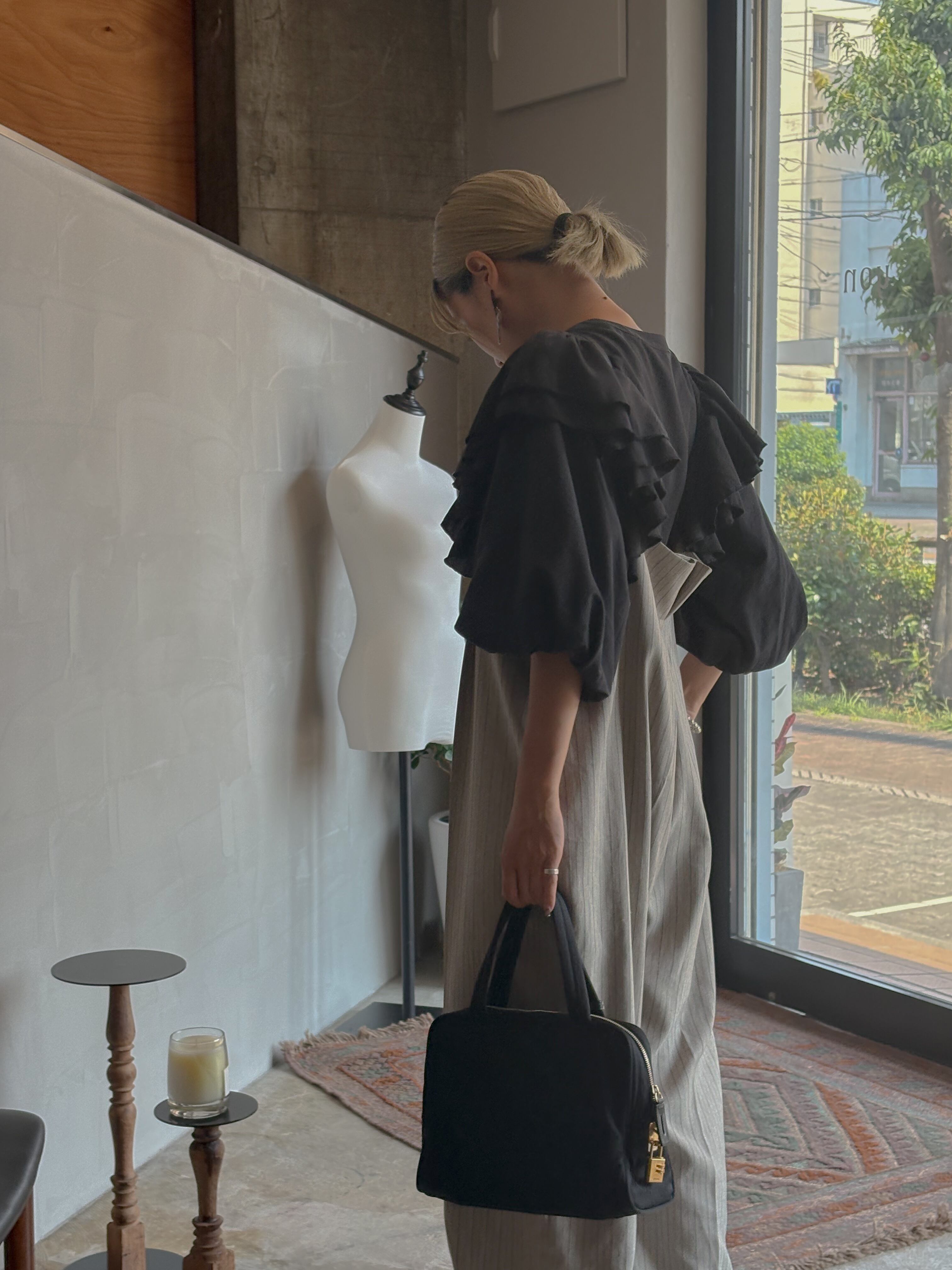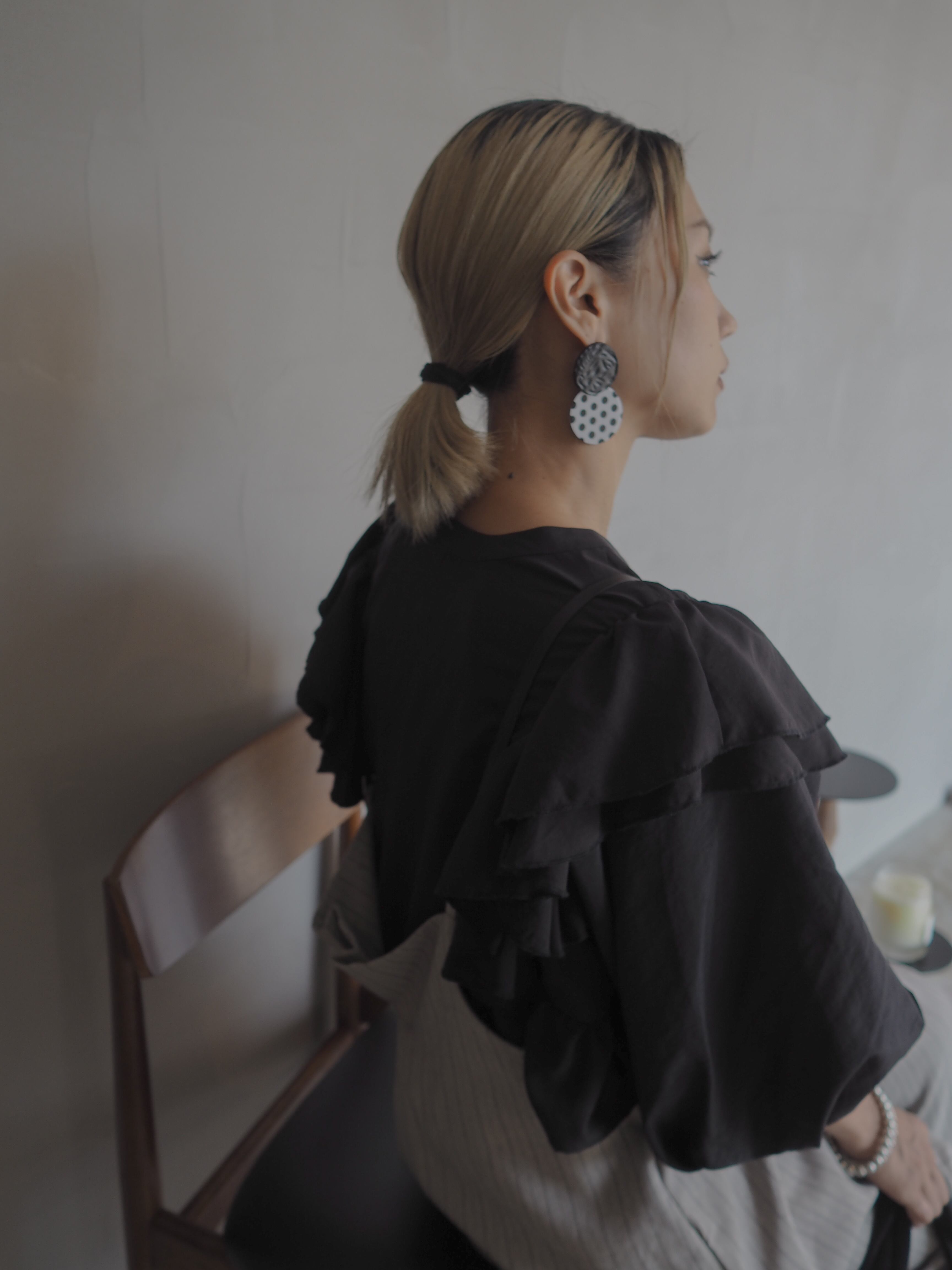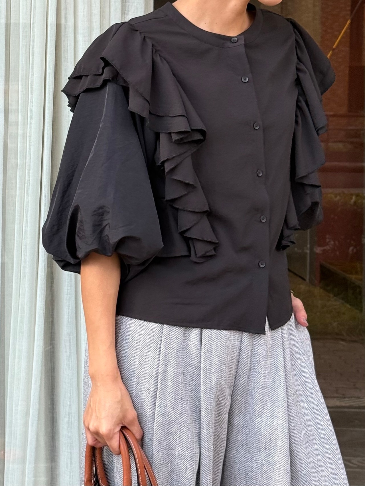 立体感あるフリルとたっぷりのボリュームスリーブが、クラシカルな品格を漂わせるフリルブラウス。モードなオールブラックでまとめても、ジャンパースカートやワイドパンツに重ねても、日常にドラマを添える一枚。