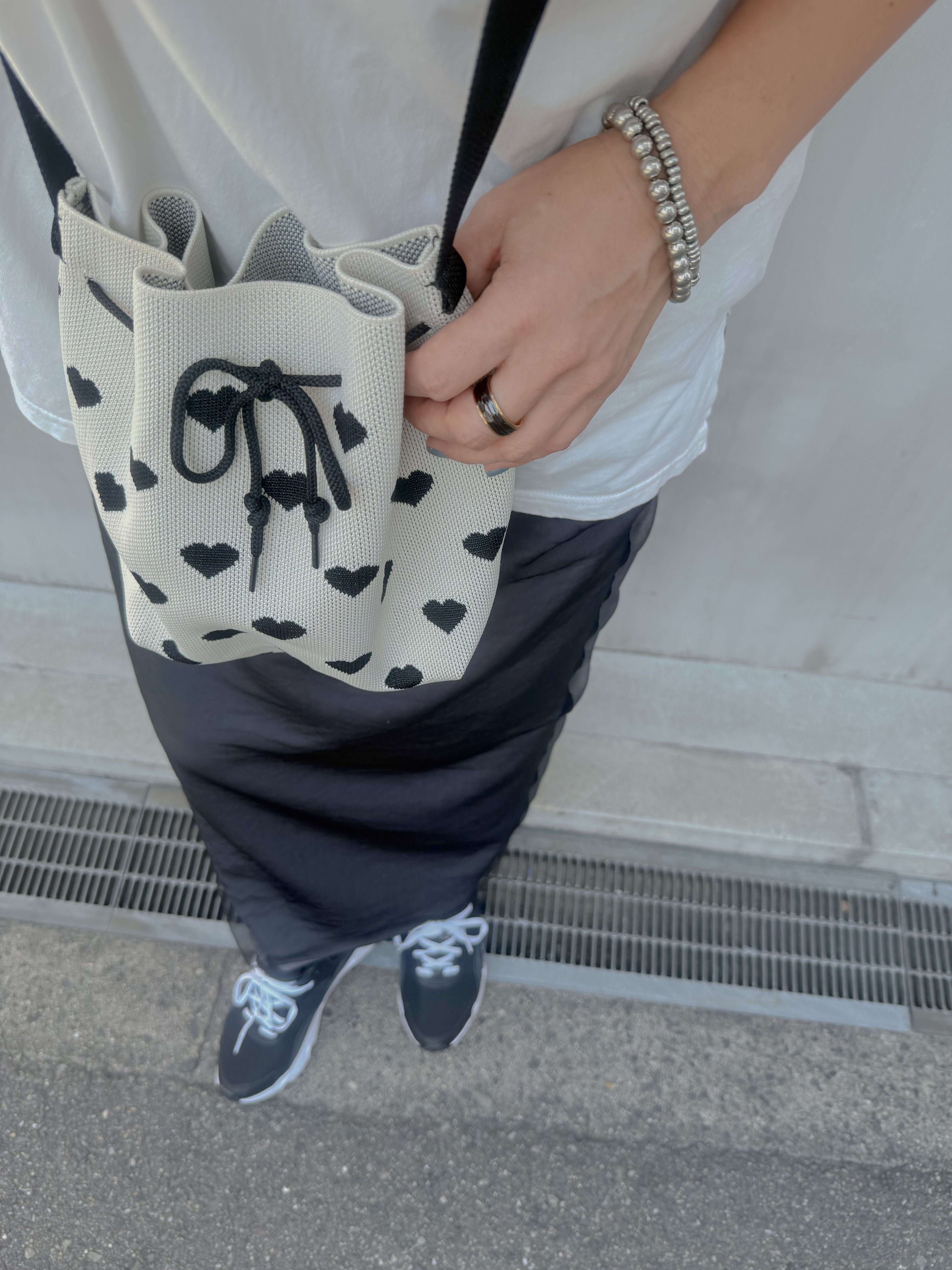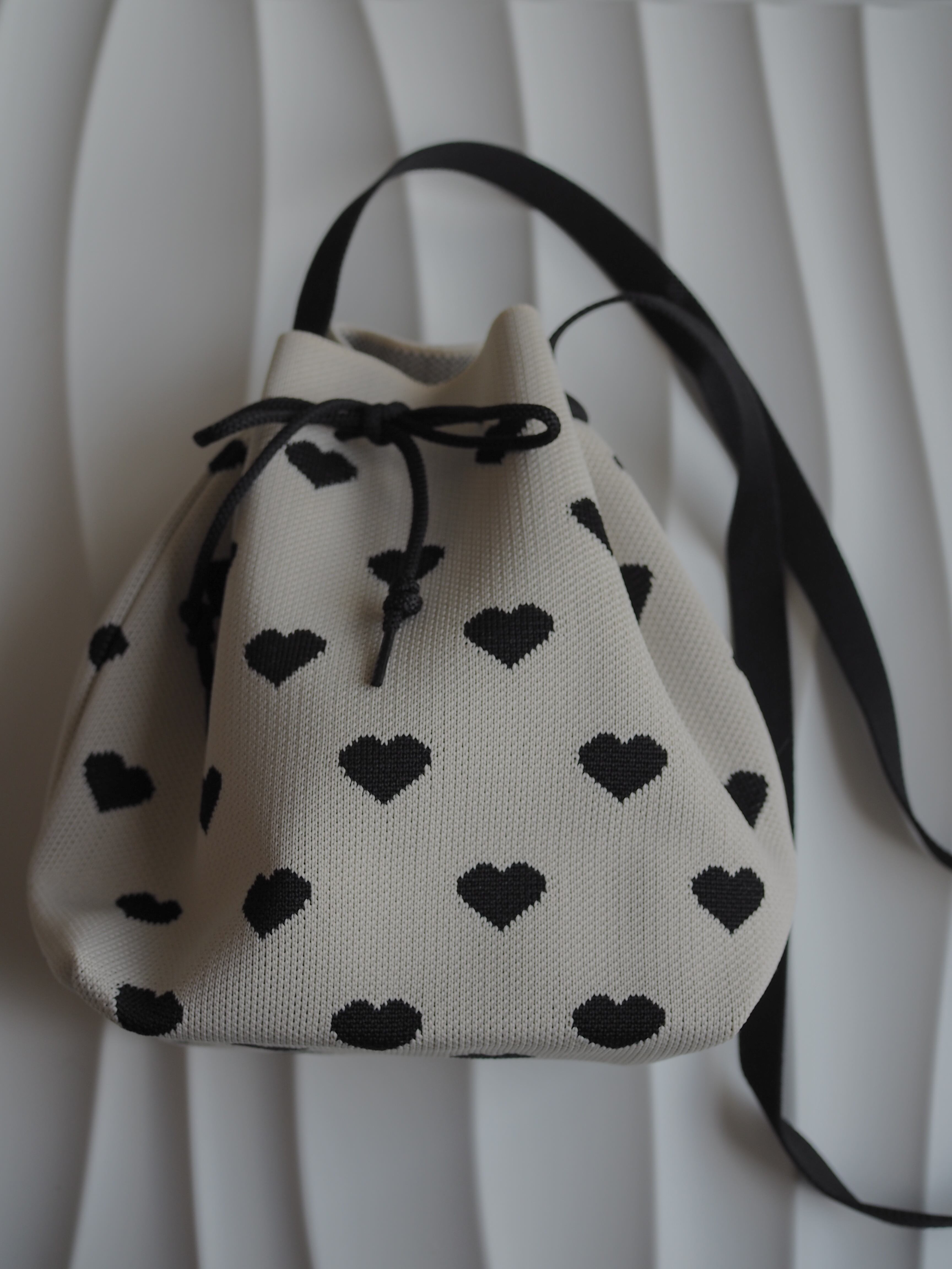 全面にちりばめられたハート柄が目を惹く、巾着型ショルダーバッグ。
