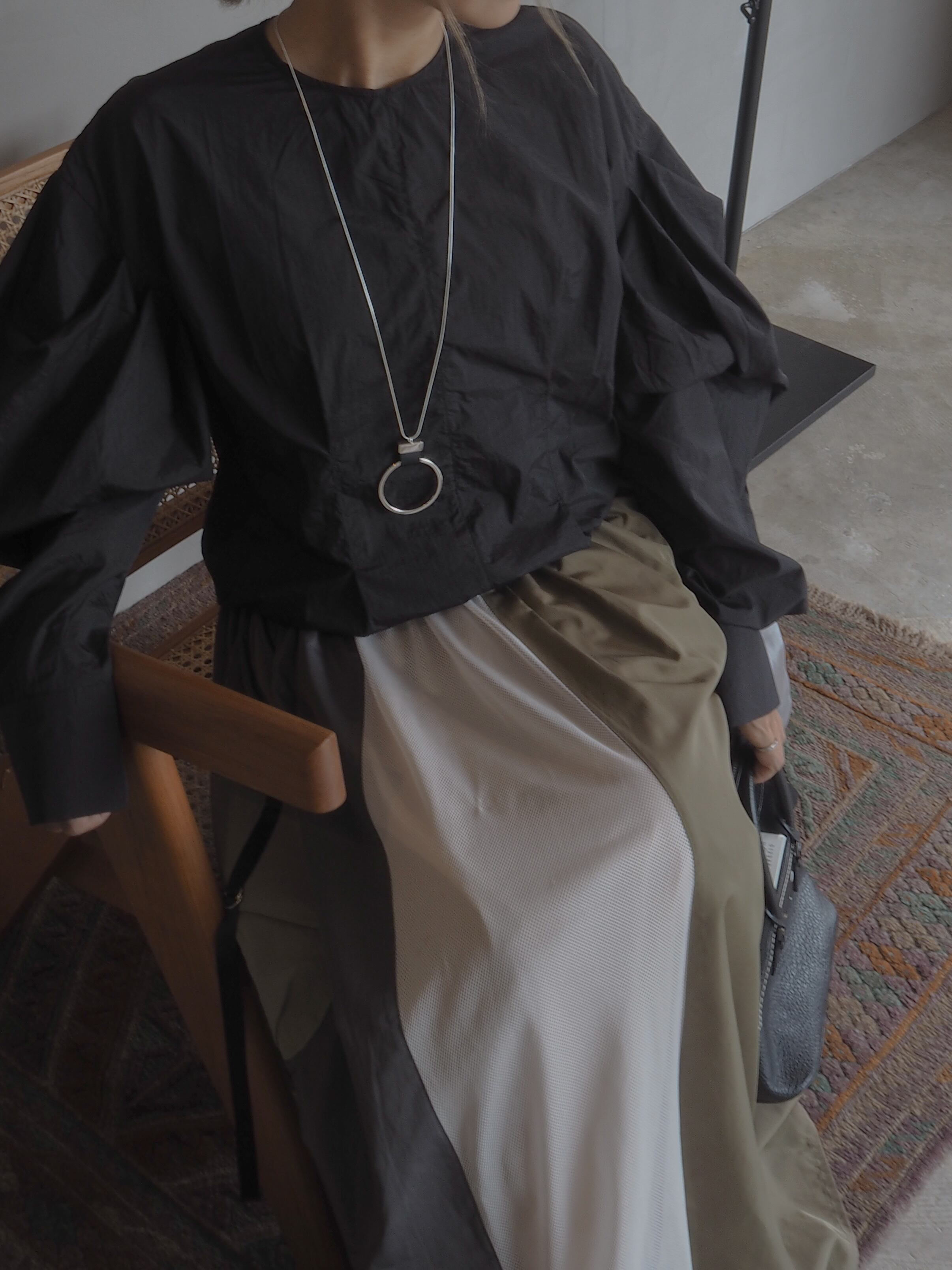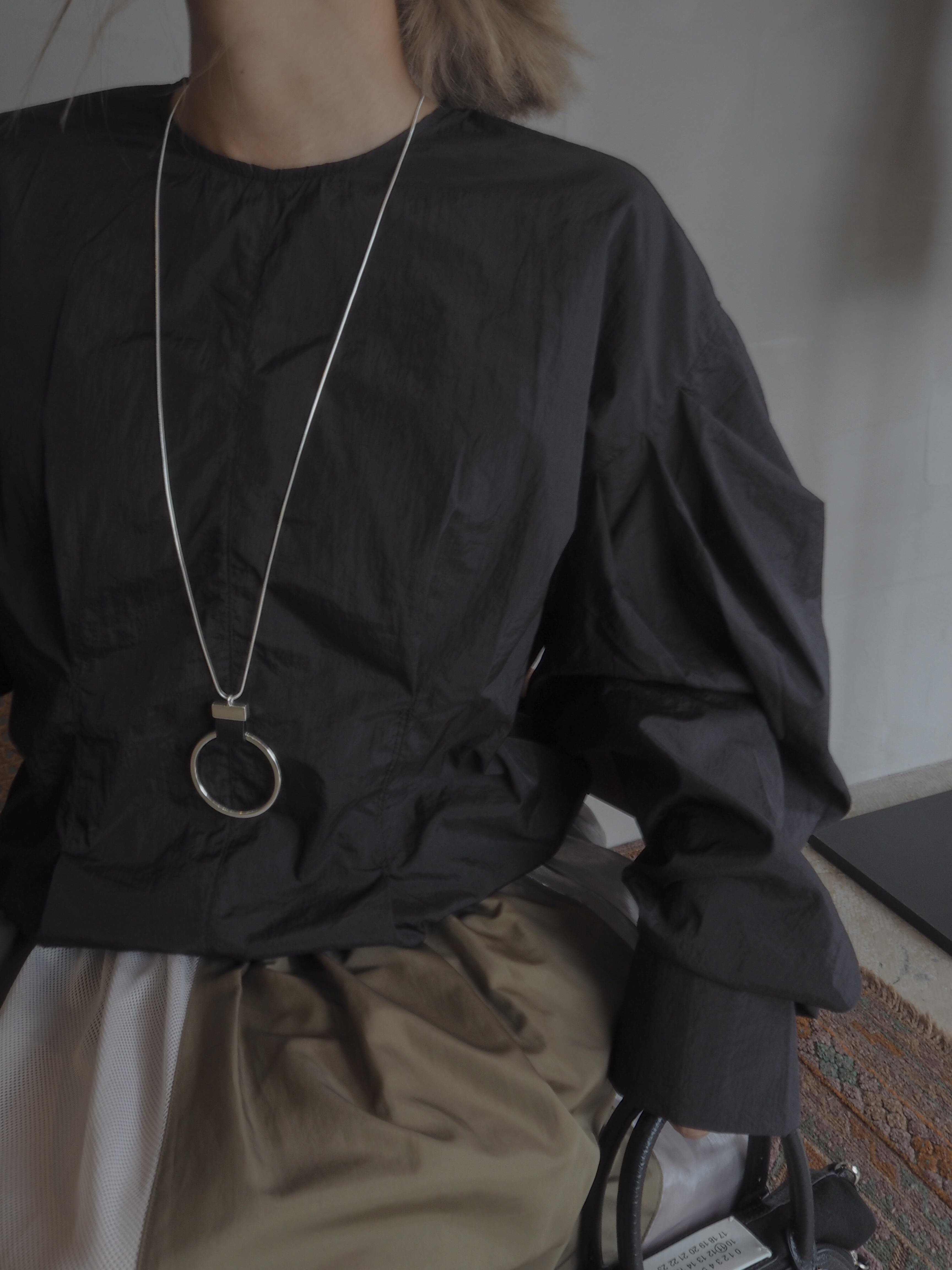 タックボリュームスリーブと、シャープなクルーネックのコントラストが美しい一枚。