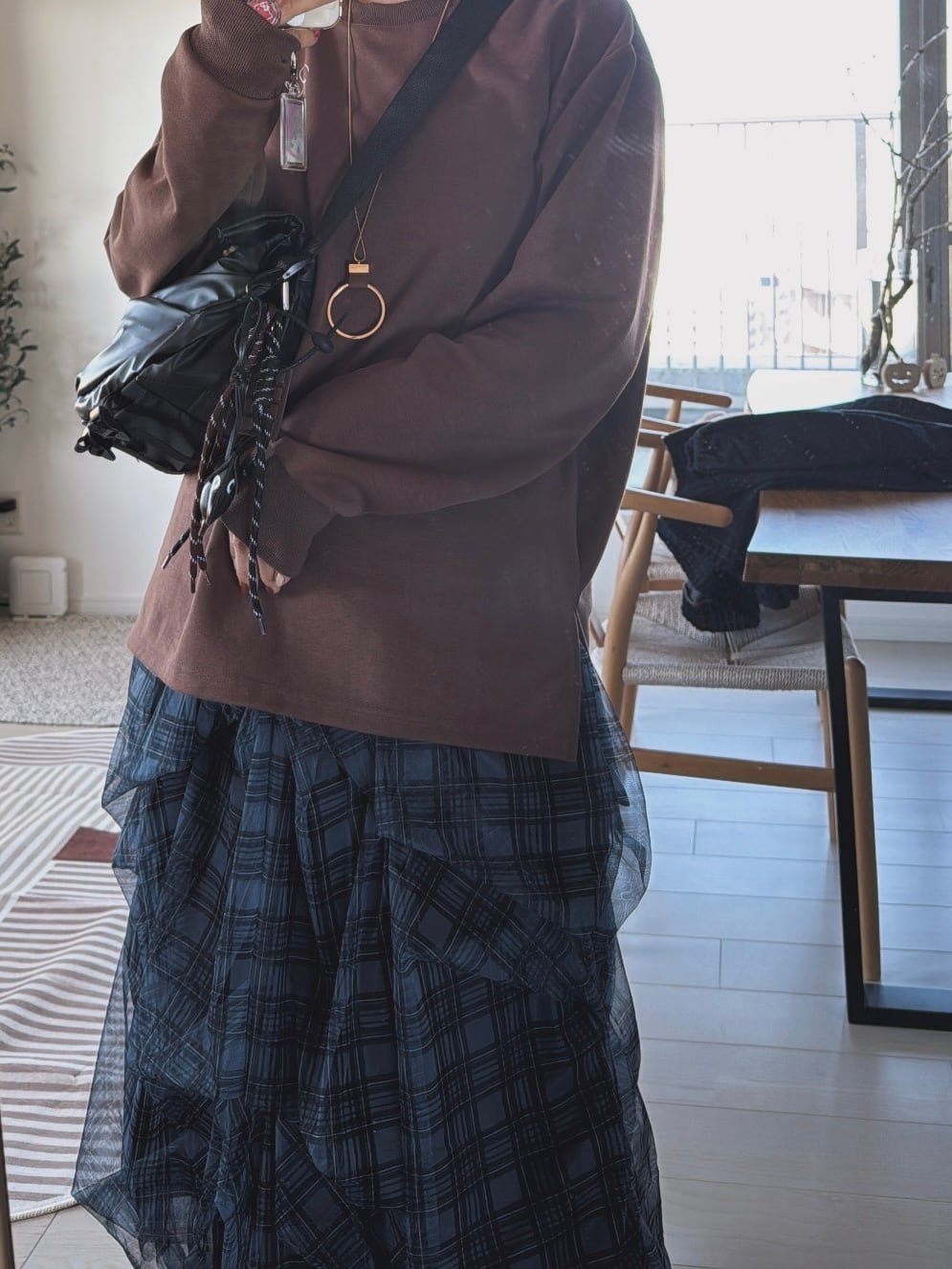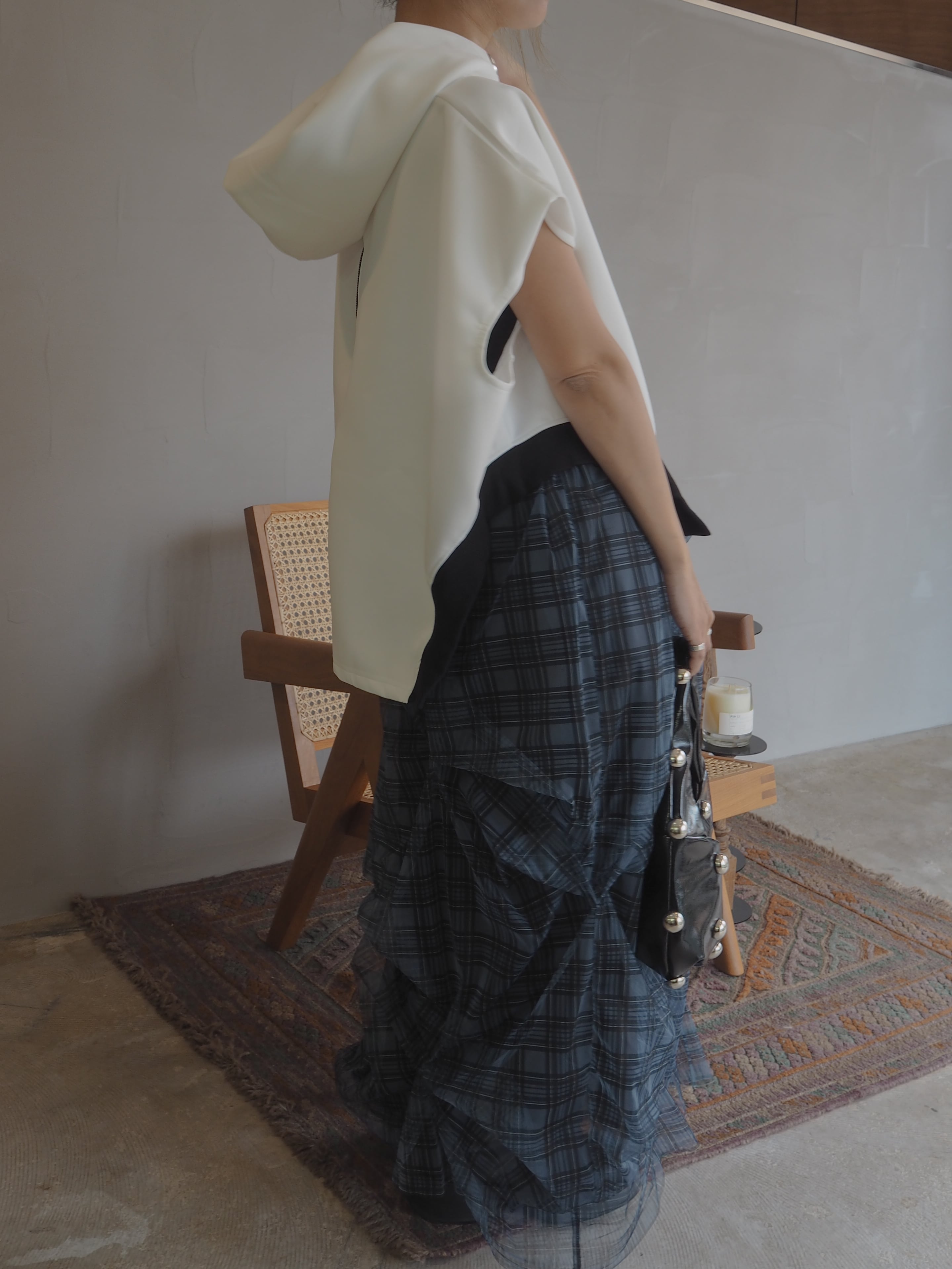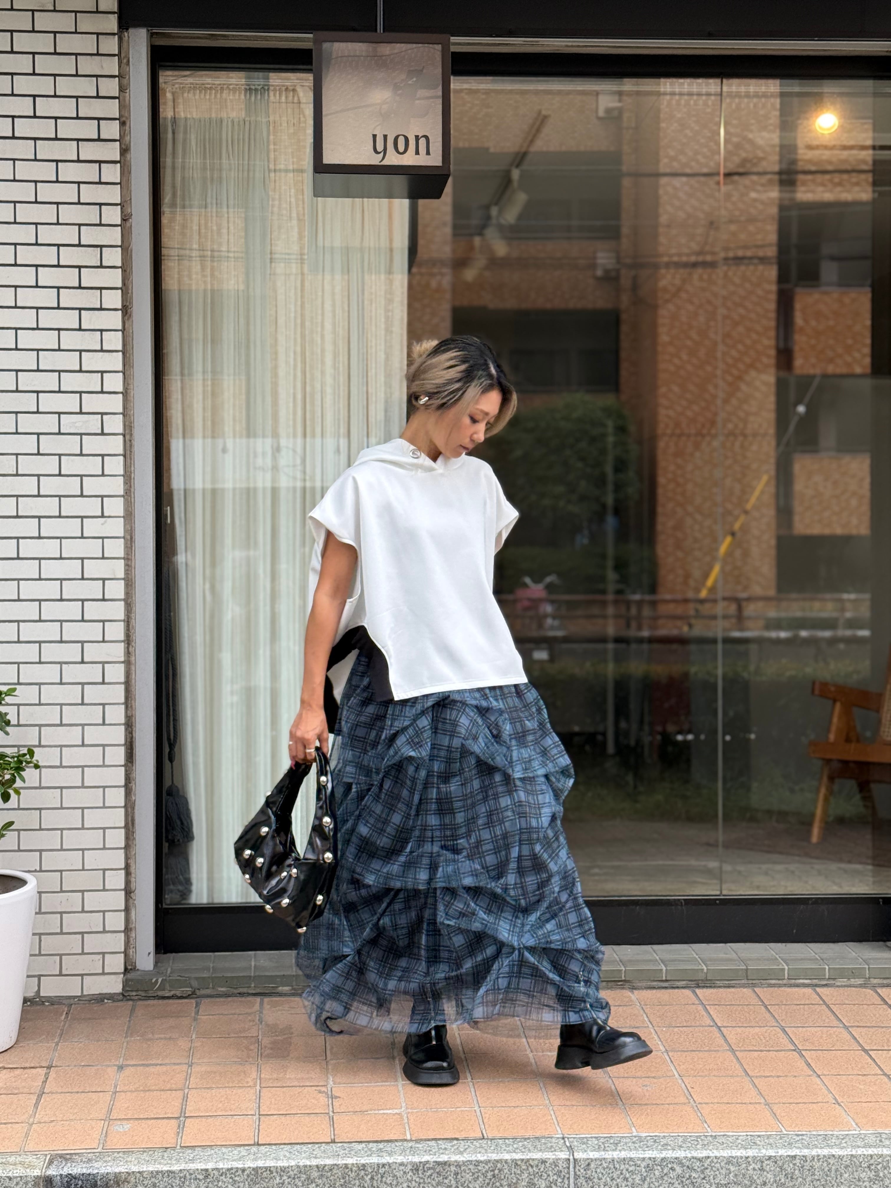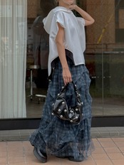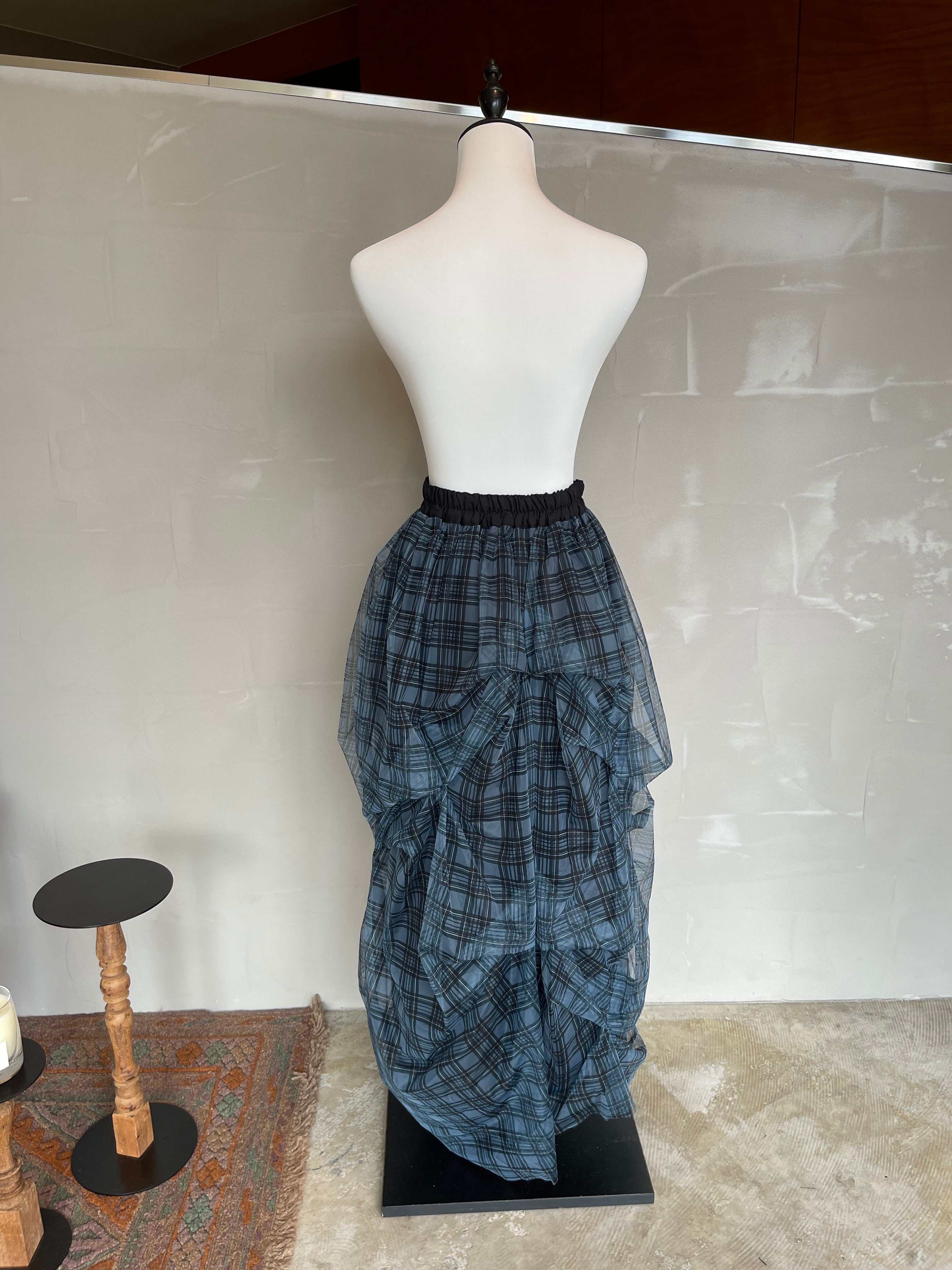 透け感のあるチュールにチェック柄を重ね、クラッシュしたようなドレープを施した存在感抜群のスカート。