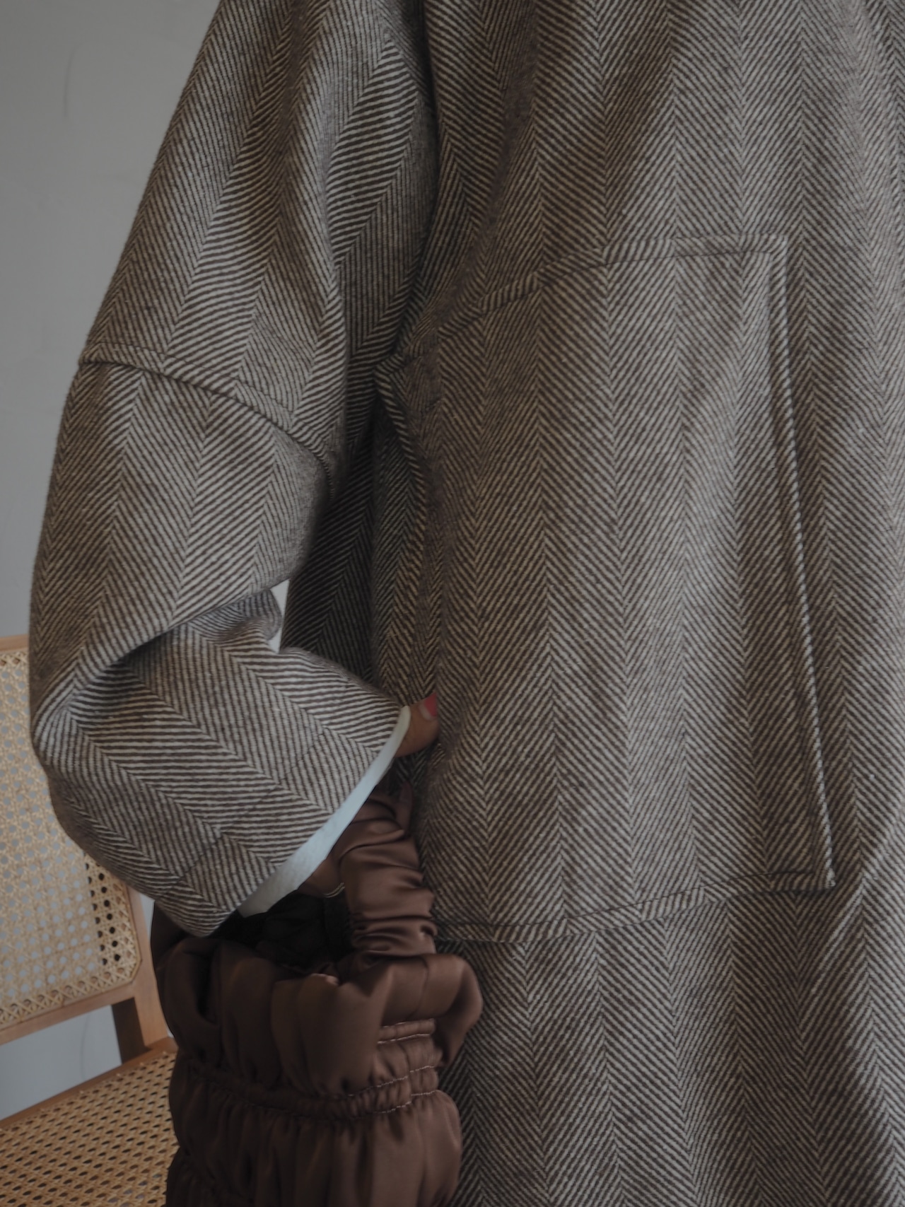 クラシカルなヘリンボーン柄を、ゆったりとしたオーバーシルエットに落とし込んだコート。