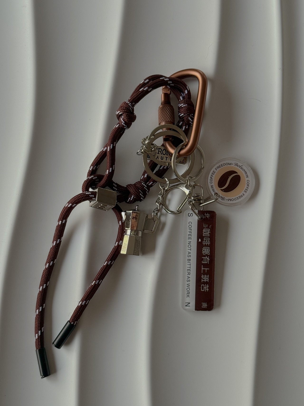 メタルパーツとプレートを組み合わせたカフェモードなキーチャーム。